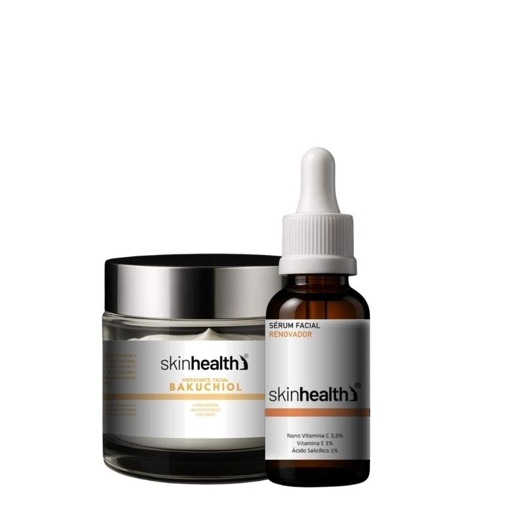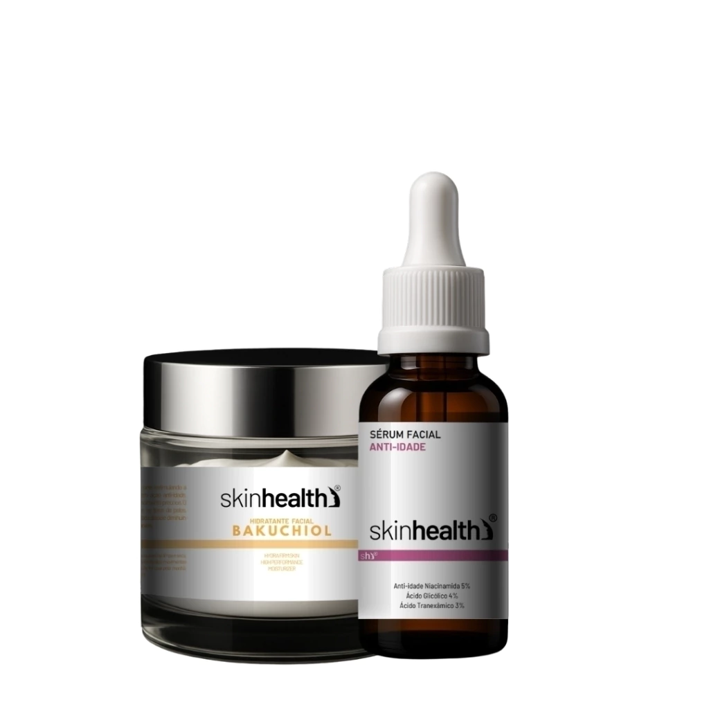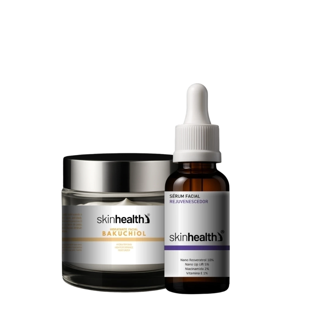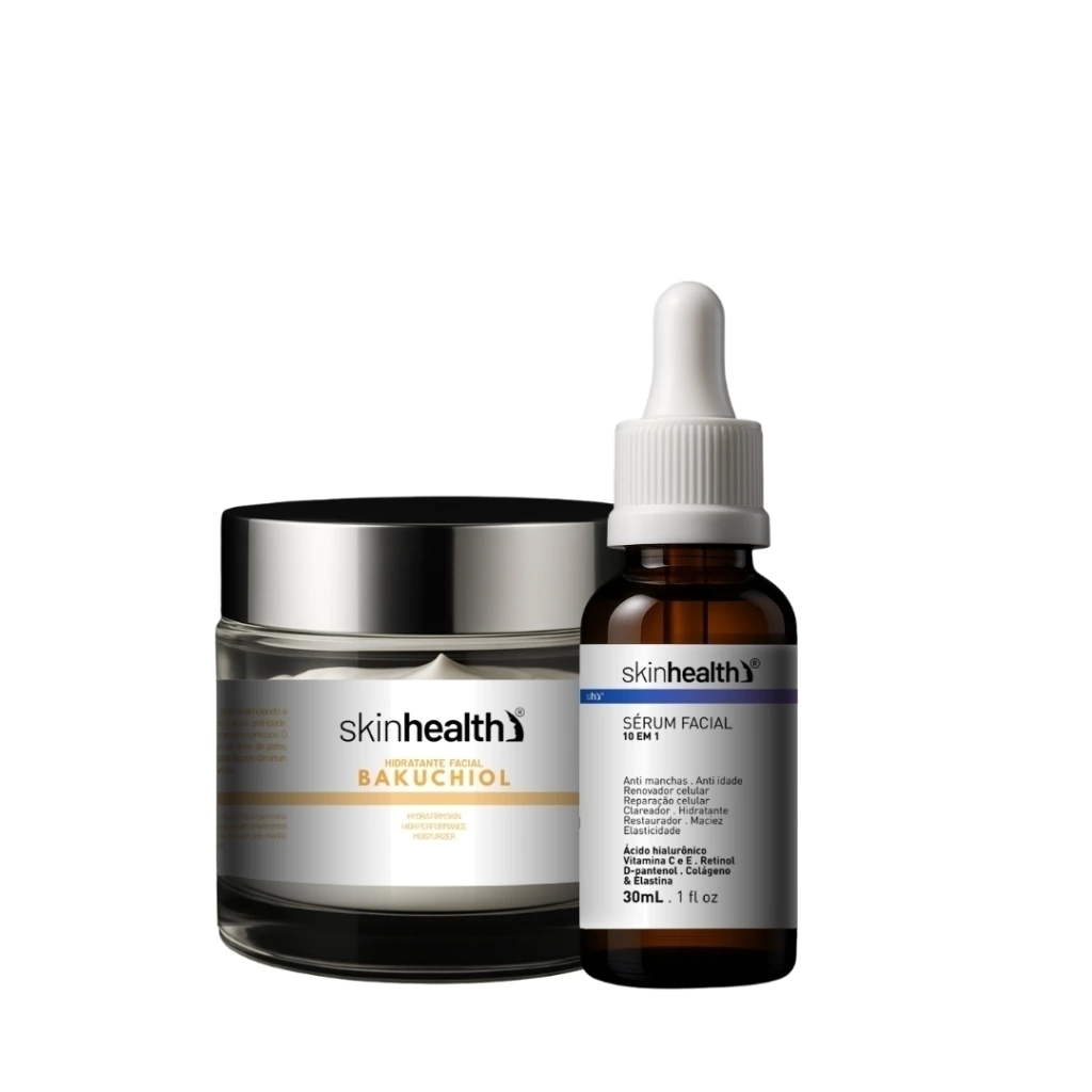 Descubra o poder do Kit Skincare Skinhealth, que combina o Creme Bakuchiol com um sérum personalizado de sua escolha, oferecendo uma rotina completa para cuidar da sua pele com eficácia e segurança.